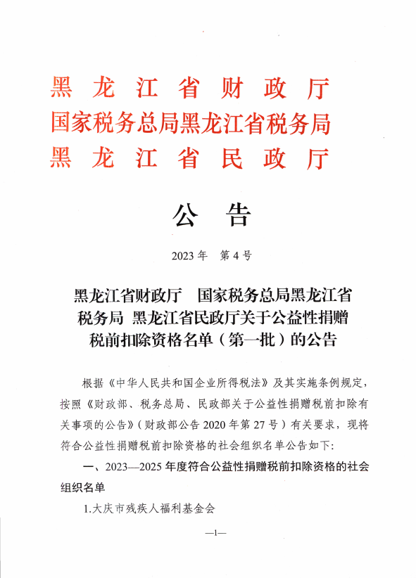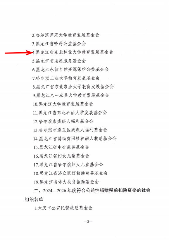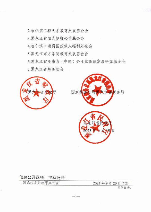 9月20日,黑龙江省财政厅、黑龙江省国家税务局、黑龙江省地方税务局、黑龙江省民政厅四部门联合发布了《关于2023-2025年度公益性捐赠税前扣除资格名单的公告》(黑财税政【2023】4号),我校教育发展基金会获得2023-2025年度公益性捐赠税前扣除资格。