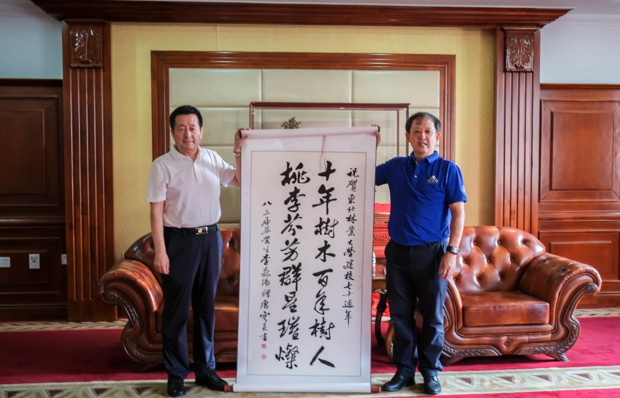 李森阳校友向母校捐赠了由天津市书法家协会主席唐云来创作的书法作品,庆贺母校建校七十周年。书法内容为“十年树木百年树人,桃李芬芳群星璀璨”,寓意东北林业大学立德树人、硕果累累。李顺龙副校长为李森阳校友颁发了捐赠证书。