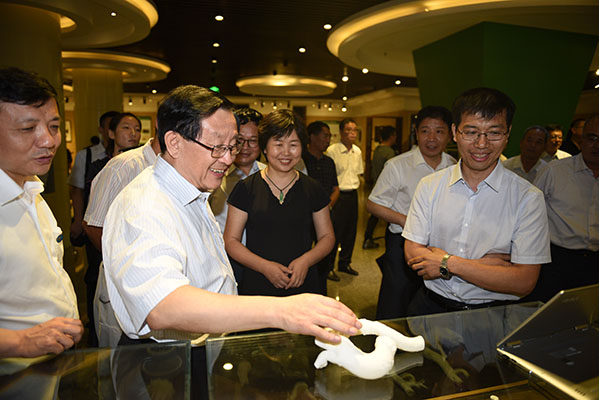 刘守新教授向万钢部长介绍了我校在木塑复合材料研究中的突破和成绩,万钢说:“对木材进行填充,要考虑到木材本身的结构,按照导管的纹理方向进行;也可以考虑将木材两端处于不同的压力,让填充材料随植物导管方向浸润。”在3D打印展台,万钢说:“现在我们解决了3D打印的成型,但要深入研究处于不同温度、不同压力、不同磁场条件下的3D打印结果,提高材料的强度等指标,为将来的应用提供数据支撑。”在听到邱兆文介绍自主开发的3D打印软件已经进入国内医院进行临床实践时,万钢说:“你们一定要将科技成果进行转化,现在国家已经有了相关的文件、相关的法律,你们要抓住机遇。”