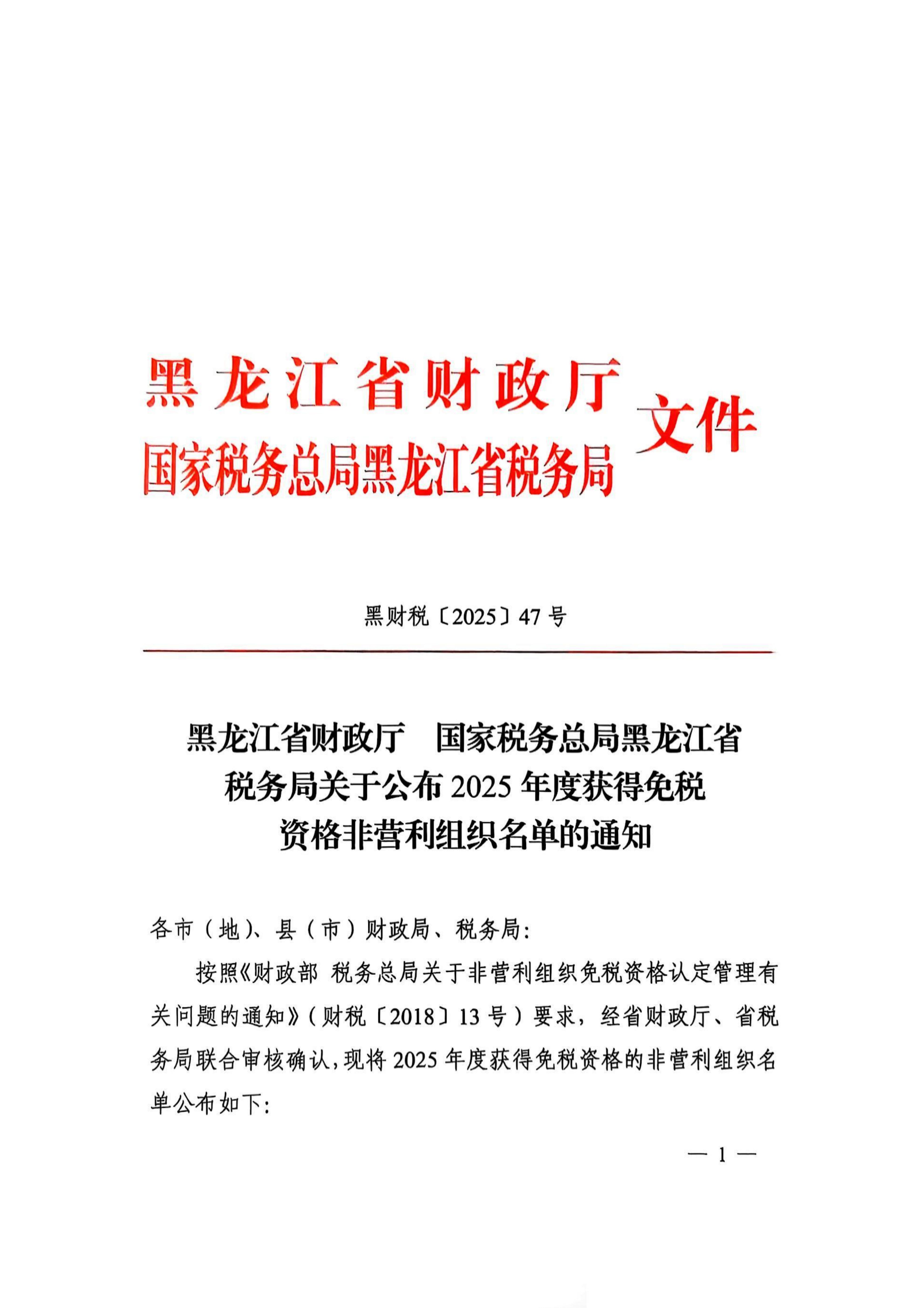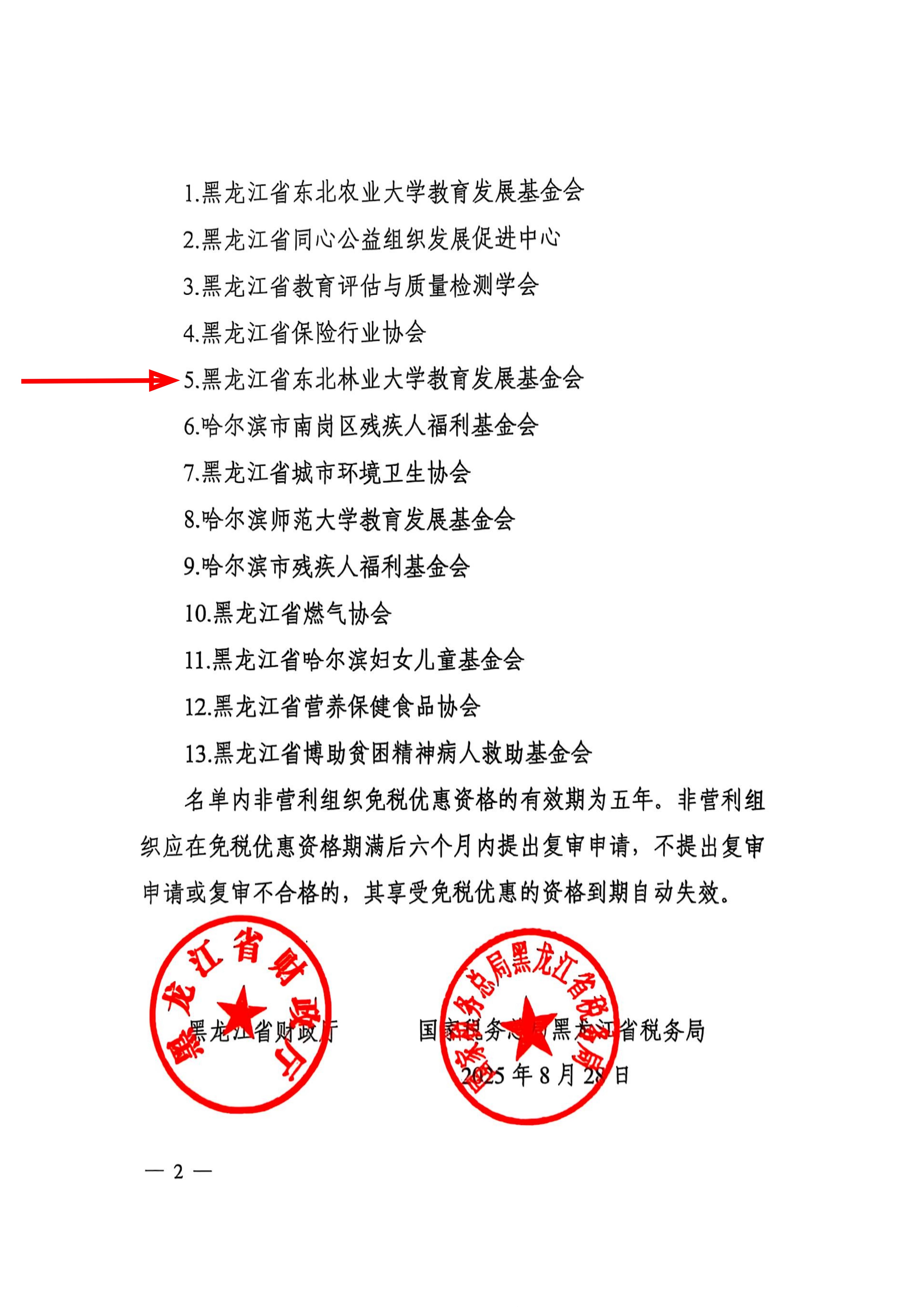 8月28日,黑龙江省财政厅、国家税务总局黑龙江省税务局联合发布了《关于公布2025年度获得免税资格非营利组织名单的通知》(黑财税【2025】47号),我校教育发展基金会获得免税资格。